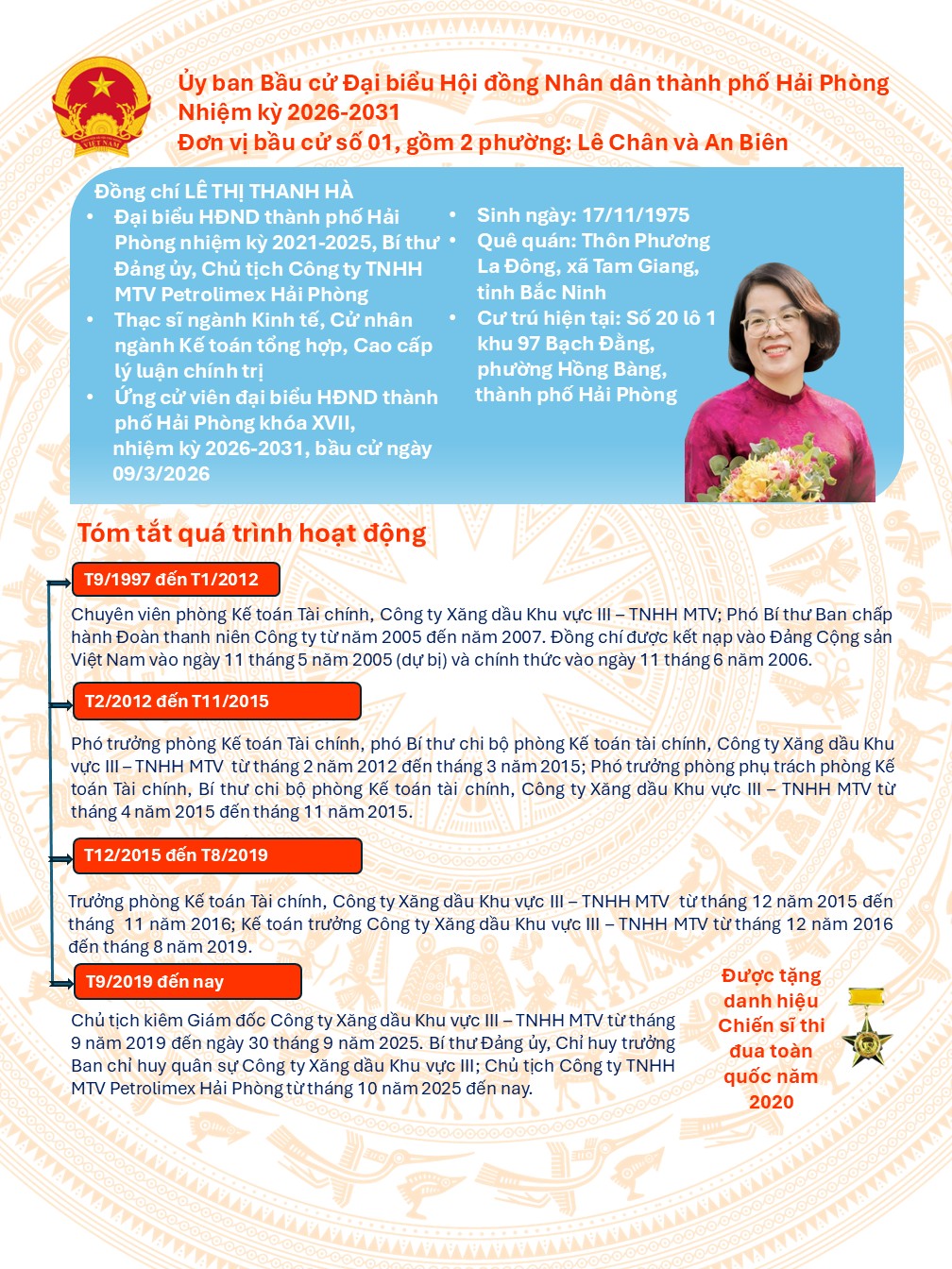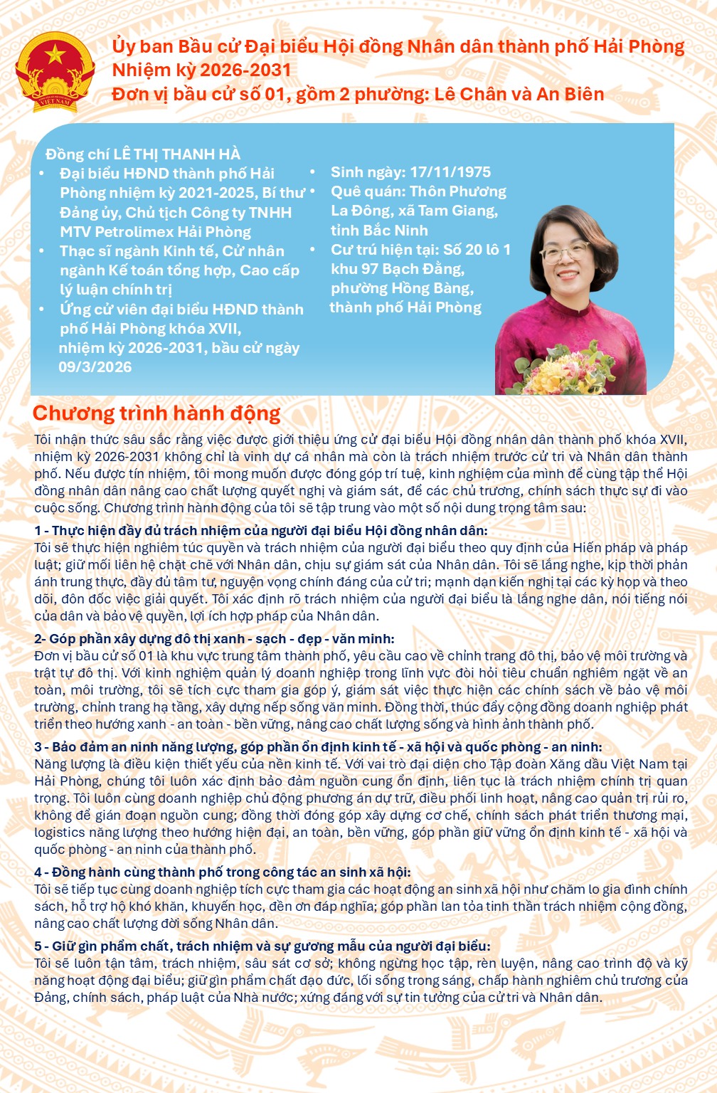 Sự kiện đồng chí Lê Thị Thanh Hà được giới thiệu ứng cử đại biểu Hội đồng nhân dân thành phố Hải Phòng khóa XVII, nhiệm kỳ 2026-2031 tại đơn vị bầu cử số 01, gồm 02 phường: Lê Chân và An Biên có ý nghĩa quan trọng, thể hiện sự ghi nhận của các cơ quan, tổ chức có thẩm quyền đối với quá trình công tác, phẩm chất chính trị, năng lực quản lý và tinh thần trách nhiệm của đồng chí trong nhiều năm qua. Đồng thời, đây cũng là cơ sở khẳng định sự tin tưởng của cử tri đối với đồng chí Lê Thị Thanh Hà trên cương vị người đứng đầu Công ty TNHH MTV Petrolimex Hải Phòng, là doanh nghiệp trực thuộc Tập đoàn Xăng dầu Việt Nam tại Hải Phòng, giữ vai trò quan trọng trong bảo đảm nguồn cung xăng dầu ổn định, an toàn, góp phần phục vụ phát triển kinh tế – xã hội và bảo đảm an ninh năng lượng trên địa bàn thành phố.